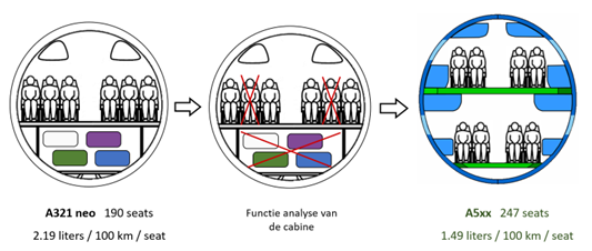 We overwegen een bestaand A321 vliegtuig om te bouwen naar de verbeterde cabine indeling. Daarmee kunnen we testen uitvoeren en kunnen we aantonen dat het concept daadwerkelijk bijdraagt aan de duurzaamheidopgave van de luchtvaart.