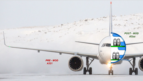 Indien reizigers uitsluitend met handbagage vliegen, kan de totale instap- en aankomsttijd met maximaal twee uur worden verkort. Deze tijdswinst maakt het mogelijk om de vliegsnelheid te verlagen van 830 km/u naar 700 km/u, zonder dat de totale reistijd verandert. Dit levert een brandstofbesparing van 8% per passagier op. Door het vrachtruim te benutten voor extra stoelen stijgt de capaciteit van een conventionele A321neo van 190 naar 247 stoelen, waardoor het brandstofverbruik per passagier met 30% wordt gereduceerd.