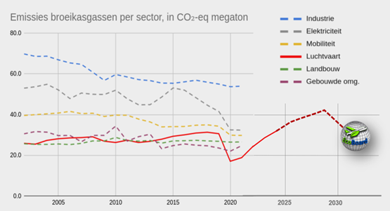 Uit onderstaande grafiek blijkt dat de CO2-uitstoot van de mobiliteitssector sinds 2005 is afgenomen, terwijl de luchtvaart juist meer bijdraagt aan CO2-vervuiling. Hoewel het aandeel van luchtvaart circa 25% is binnen de getoonde sectoren, zorgt de snelle groei van de sector en het uitblijven van verbeteringen ervoor dat luchtvaart achterblijft op het gebied van duurzaamheid.